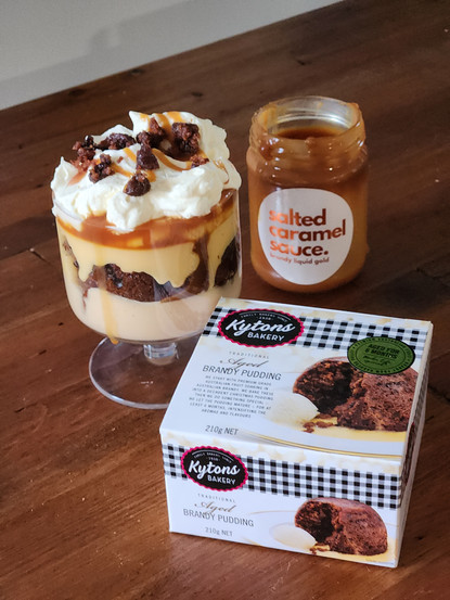 prepare the custard, cool slightly and add a dollop of Brandy Salted Caramel Sauce. Add on top of the pudding and let set.